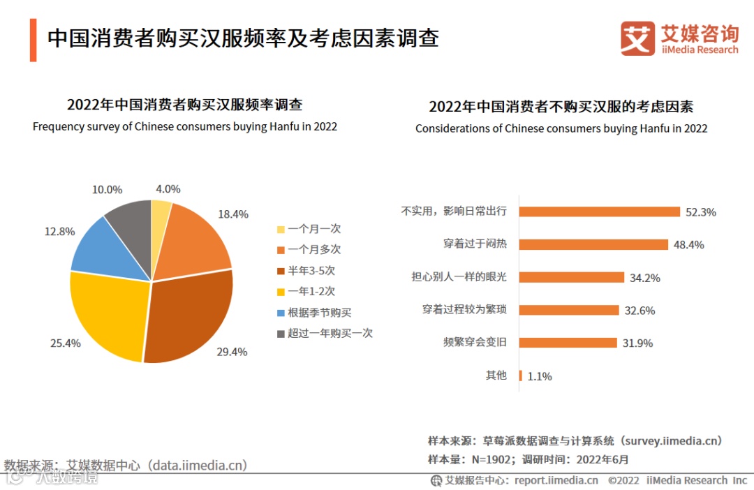 调研数据显示,2022年,半年购买3-5次汉服的消费者占比最多,为29.4%,其次为一年购买汉服1-2次的消费者,占比为25.4%;消费者不购买汉服最多考虑的因素是不实用,影响出行和穿着过于闷热。艾媒咨询分析师认为,汉服品牌可提高汉服的实用性,采用轻薄的面料制作汉服,提高自身产品的市场竞争力。