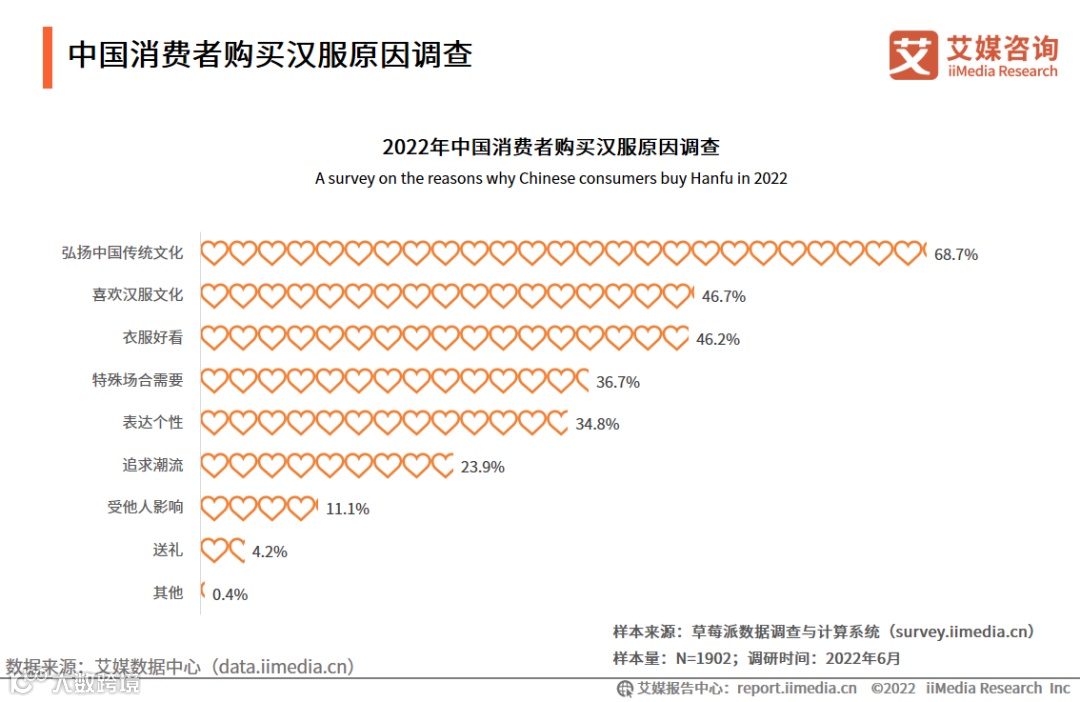 调研数据显示,2022年,弘扬中国传统文化是消费者购买汉服的主要原因,占比达68.7%;其次为衣服好看和喜欢汉服文化,占比分别为46.2%和46.7%;因为特殊场合需要和表达个性购买汉服的消费者占比分别为36.7%和34.8%。艾媒咨询分析师认为,汉服独特的文化属性是其受到消费者和市场青睐的原因之一。