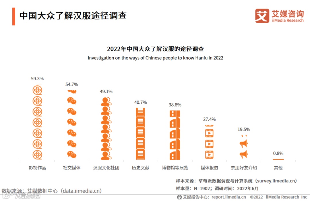 调研数据显示,2022年,59.3%的中国大众通过影视作品了解汉服,54.7%的中国大众通过社交媒体了解汉服,其次了解汉服的途径为汉服文化社团、历史文献和博物馆等展览,占比分别为49.1%、40.7%和38.8%。艾媒咨询分析师认为,线上平台和线下社团、博物馆等途径共同促进了汉服文化的推广和传播,增加了中国民众对汉服文化的了解程度。