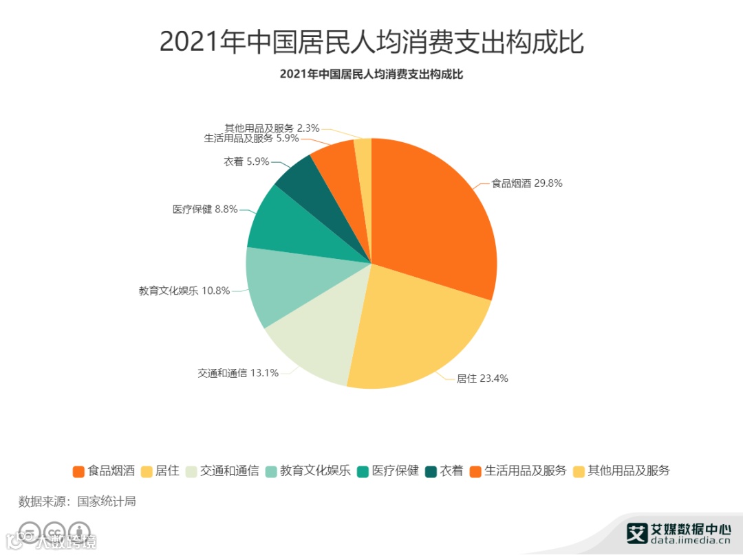 随着国家经济实力的提升,人们早已告别了从前只为“温饱”的年代,大众的需求已经从“谋生”向“谋发展”转型升级。艾媒数据中心(data.iimedia.cn)显示,在2021年中国居民人均消费支出构成中,食品烟酒占比为29.8%,居住占比为23.4%,交通和通信占比为13.1%,教育文化娱乐一项则占比为10.8%。都说“衣食住行”是民生“四道”,如今却不然了,教育文化娱乐已成为超越衣着打扮的第四大支出渠道。这也体现了在物质基础得到满足之后,人们对精神层面的需求进一步加大。