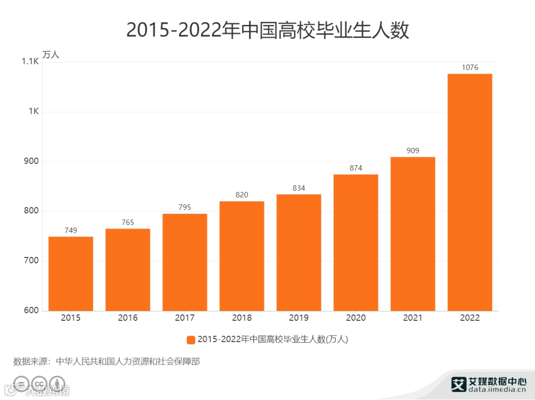 近年来,社会竞争也日趋激烈,艾媒数据中心(data.iimedia.cn)显示,2022年中国高校毕业生数量激增,达到了1076万人。
