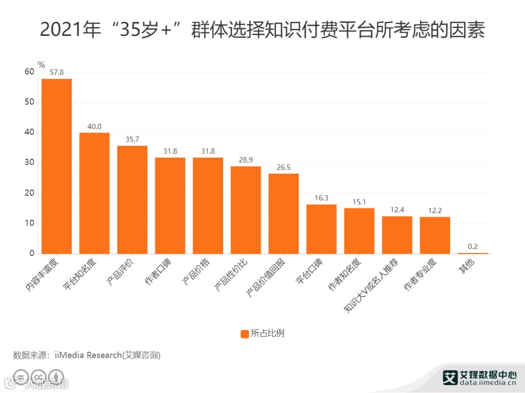 就“35岁+”群体来看,他们已经普遍开始组建家庭,中年职场危机与家庭责任压力较大,面对的是事业、金钱、家庭、健康等重重关卡,所以许多人会通过知识付费的手段去获取信息和方法,缓解社会节奏加快所带来的焦虑。而在对知识付费平台的选择上,平台内容的丰富度成为了他们首要考虑的因素。