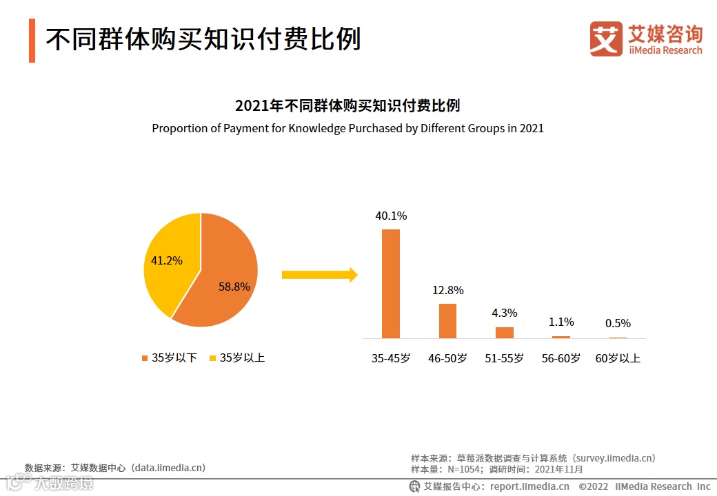 此外,调研数据显示,35岁以上的群体购买知识付费的比例为41.2%,其中,35-45岁群体占比40.1%,46-50岁群体占比12.8%。