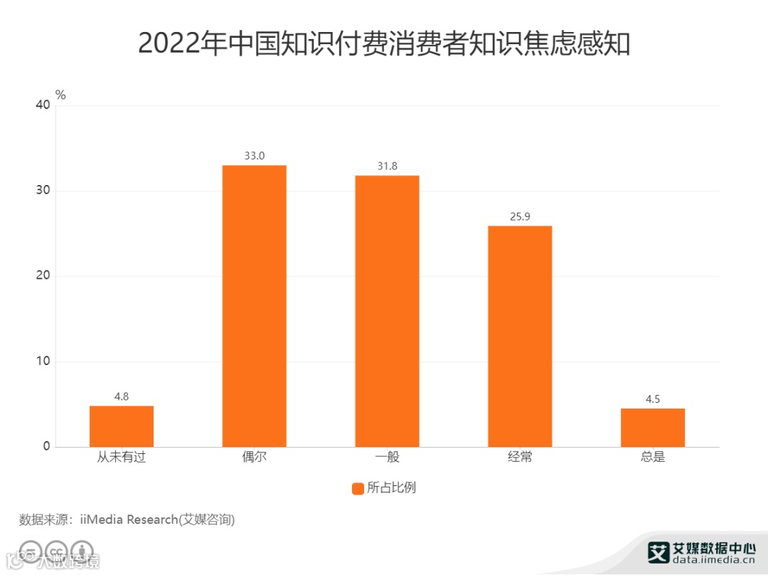 从某种意义来看,“内卷化”其实是一种不健康的现象,会给人们增加无形的不必要的精神压力,这种压力会时常给人传递出焦虑感。艾媒数据中心(data.iimedia.cn)显示,2022年超过九成的中国知识付费消费者有焦虑感知,而有超三成的受访消费者经常或总是有知识焦虑感知。