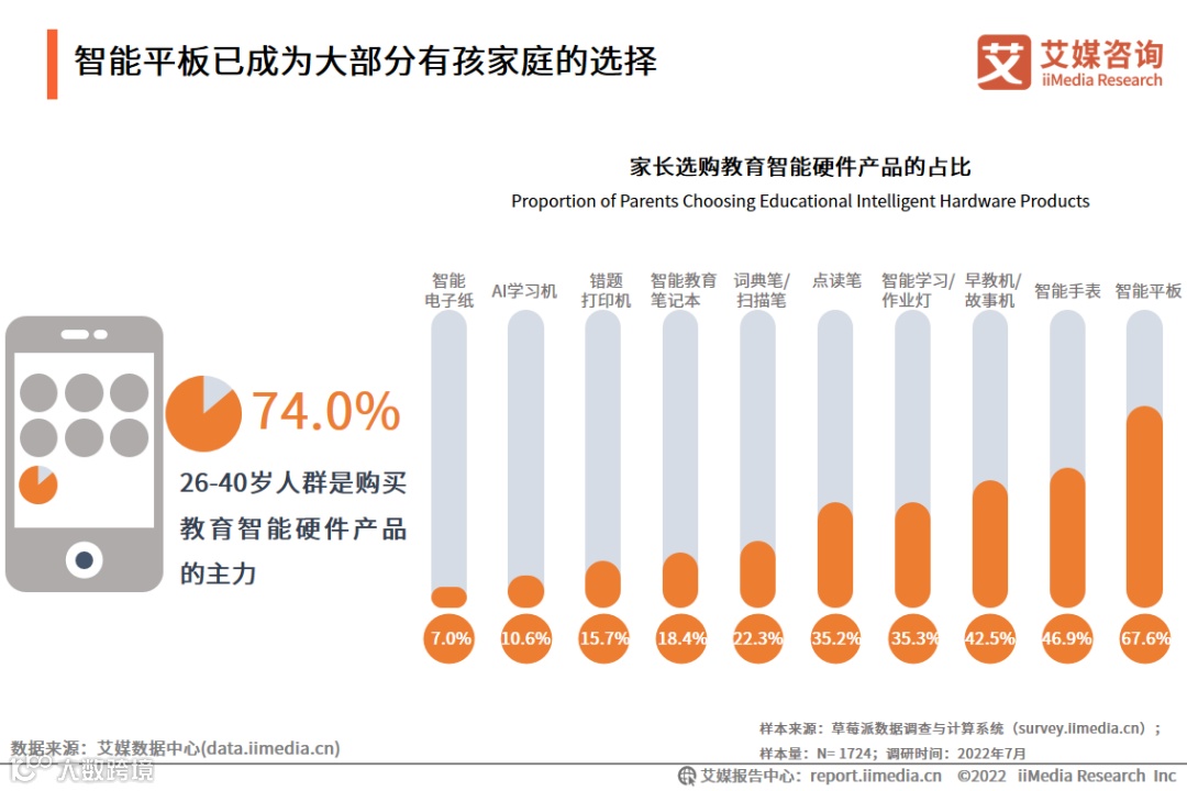 调研数据显示,26-40岁人群是购买教育智能硬件产品的主力,占比高达74.0%。其中,购买智能平板的家庭占比最多,达到67.6%,购买智能手表的家庭占比46.9%。艾媒咨询分析师认为,目前教育智能平板和手表已成为大多数有孩家庭的标配,教育智能硬件厂商更应该注重其产品的内容,保护青少年的成长。