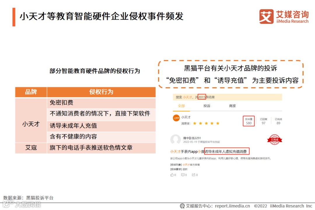 小天才电话手表在2022年6月29日被媒体报道,其内置游戏软件诱导儿童充值。在黑猫投诉平台,以“小天才”为关键词进行搜索,可以得到2015条投诉信息,投诉的内容也是以“免密扣费”“诱导充值”为主。除了小天才之外,在2022年3月,艾寇的儿童电话手表也被媒体曝光,给儿童推送两性软色情的文章。