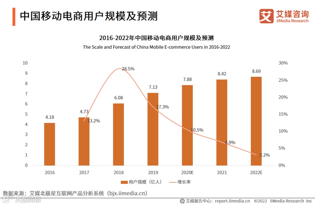 iiMedia Research(艾媒咨询)数据显示,2022年移动电商用户规模有望达到8.69亿人,但增幅有所下降。艾媒咨询分析师认为,随着电商体系在中国发展成熟,用户规模逐渐触达网民规模天花板,流量获取成本也越来越高,“直播+电商” 的模式已成为电商行业的一大风口。