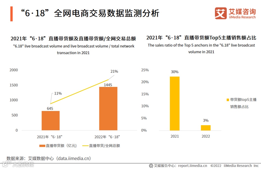 2021年,全网TOP5主播销售额占直播带货销售额比例从去年的30%下降至3%,头部集中度的下降和店播的增长推动生态向健康发展。