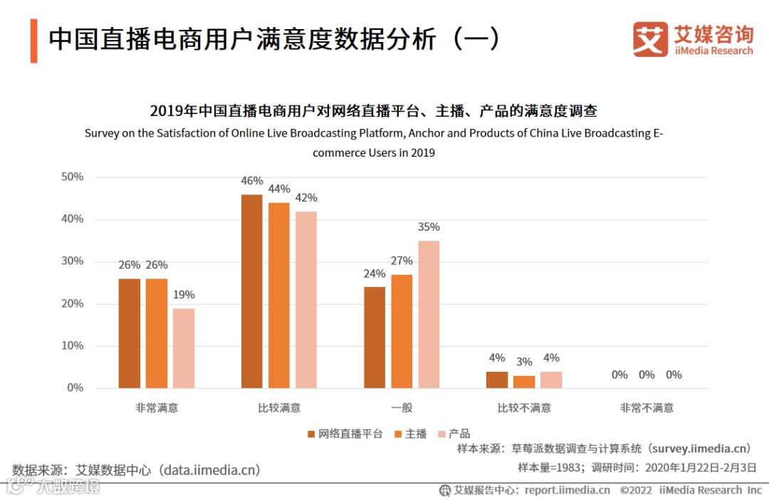 iiMedia Research(艾媒咨询)数据显示,受访用户对直播电商的综合满意度较高,其中对网络直播平台、主播和主播推荐的产品的满意度都超过60%,仅有少部分人表示比较不满意。
