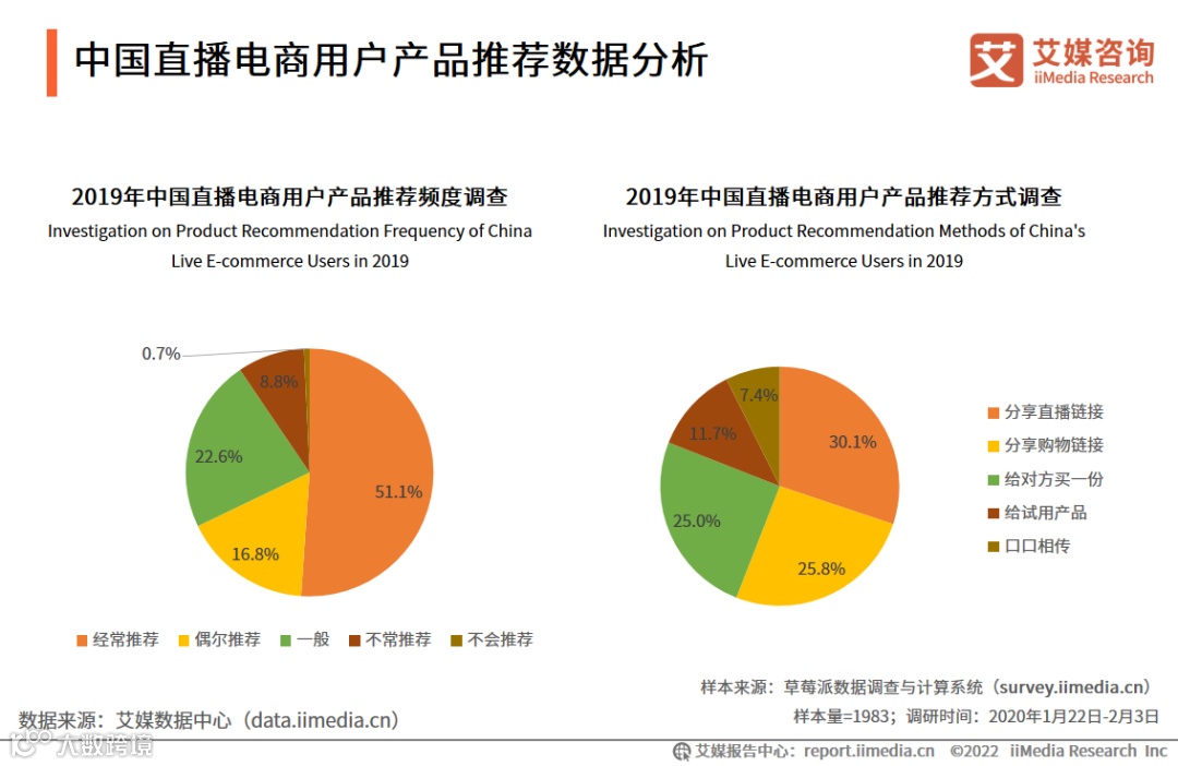 iiMedia Research(艾媒咨询)数据显示,直播电商用户经常向他人推荐产品的比例为51.1%,不会推荐的仅占0.7%。直播电商用户主要通过分享直播链接、分享购物链接和给对方购买产品的方式进行推荐。