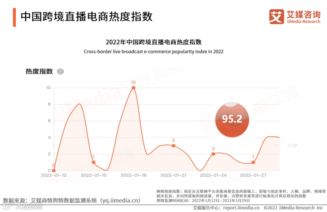 近年来随着人民生活水平的提高,跨境电商开始孕育出巨大的增长势能,日益发展成为电商平台不可忽视的驱动引擎,展现出惊人的爆发力。跨境直播电商热度在2022年1月呈现较大的增长趋势,其艾媒言值高达95.2。艾媒咨询分析师认为,受国内跨境电商日益成熟和疫情的影响,直播电商的影响逐渐辐射到海外,为中国的贸易商出海奠定了良好的基础。