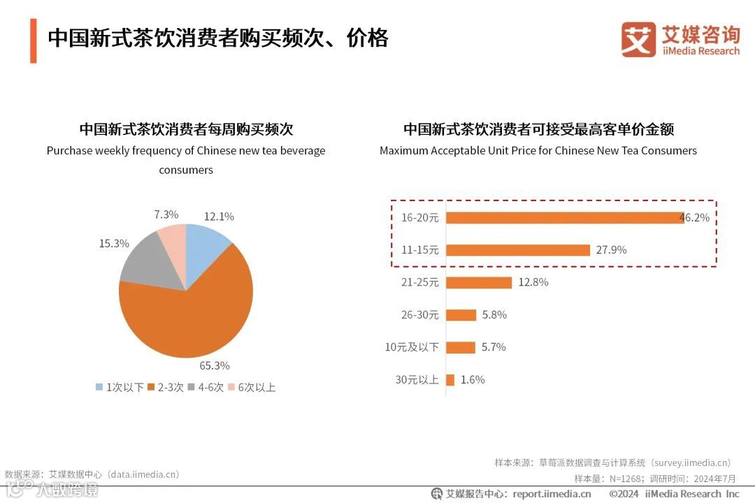 iiMedia Research(艾媒咨询)调研数据显示,65.3%的中国新式茶饮消费者表示每周购买2-3次新式茶饮;消费者能接受新式茶饮的最高客单价区间为16-20元,占比达46.2%。艾媒咨询分析师认为,新式茶饮市场消费者认知程度加深,大多数新式茶饮消费者购买频次增多,大众价格为最佳价格区间,企业应着重打造“高质、性价比”产品。