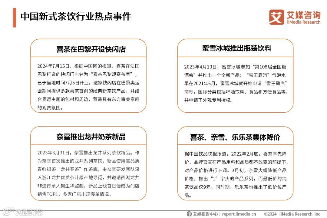 喜茶的产品研发能力不断提升,持续打造爆款。2023年果茶系列经典依旧,如酷黑莓桑、喜柿多多、多肉桃李等,轻乳茶系列涌现多个爆款,如水云间、天青雨等。喜茶深入5个省份12个茶叶核心产区,创新推出包括素馨茉莉、夏栀白茶在内的近20款茶叶。同时,喜茶还联合深圳市标准院发起真茶应用研究,并发布《喜茶真茶标准》,再次重申拒绝使用香精茶和速溶茶粉,推动行业进入0香精茶时代。