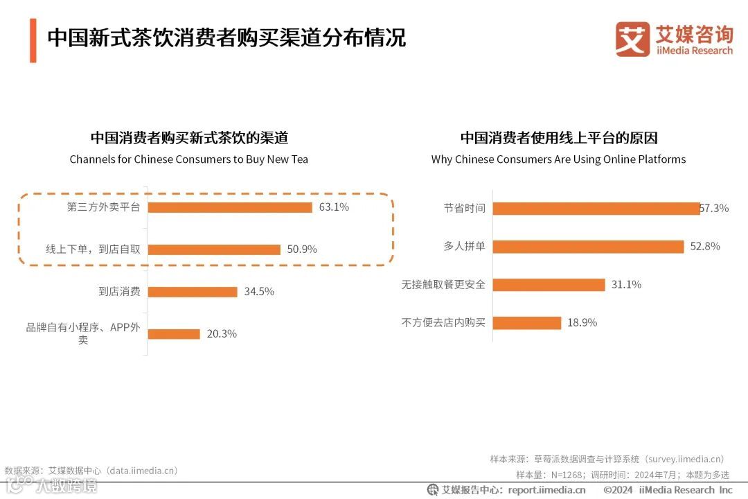 iiMedia Research(艾媒咨询)调研数据显示,新式茶饮消费者在购买渠道上,第三方外卖平台(63.1%)和线上下单、到店自取(50.9%)是比较受欢迎的两种方式。消费者选择线上购买的主要原因有节省时间、多人拼单。艾媒咨询分析师认为,消费者选择线上消费主要考虑方便省时和安全两个方面,品牌可以提升配送效率和服务质量,以吸引到更多消费者。