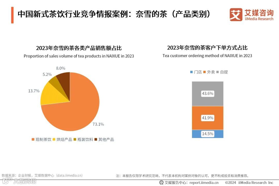 2023年奈雪的茶现制茶饮、烘焙产品、瓶装饮料其他产品的销售额占比分别为73.1%、13.7%、5.2%和8.0%。2023年,客户下单方式中通过小程序自提的金额居首位。艾媒咨询分析师认为,奈雪的茶主打产品仍是现制茶饮,消费者下单方式有所改变,疫情过后,线下消费回暖,消费者线上消费习惯已养成。企业需兼顾线上线下消费者需求,打好组合拳。