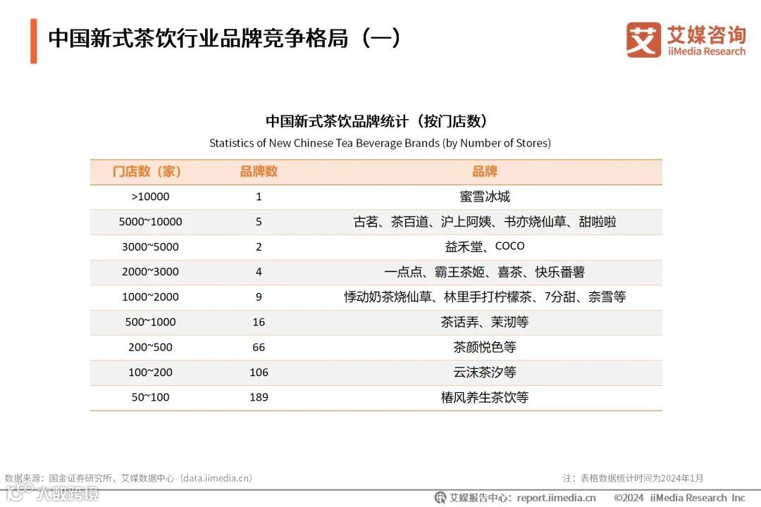 从品牌数和门店分布数量上来看,中国新式茶饮行业竞争格局呈金字塔型。蜜雪冰城以超过10000家门店领先,门店数量在5000-10000家的品牌定位均为大众价格带,如古茗、茶百道、沪上阿姨等。随着门店数减少,品牌数量急剧增加,特别是在50-200家门店区间的长尾中小品牌数量较多,反映出新式茶饮市场内中小品牌的激烈竞争。
