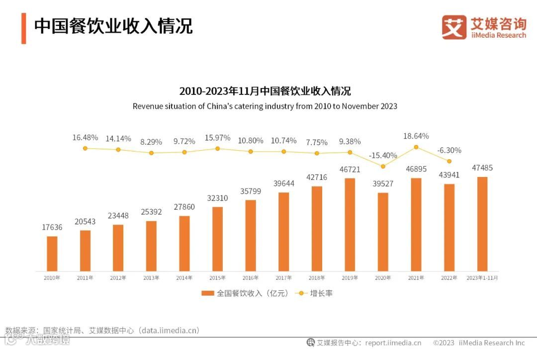 数据显示,2023年1-11月中国餐饮收入累计47485 亿元。虽2022年中国餐饮收入略有下降,但2010年-2022年间中国餐饮收入整体呈上升趋势。艾媒咨询分析师认为,中国餐饮市场将迎来复苏潮,2024年全国餐饮业收入有望进一步提升。
