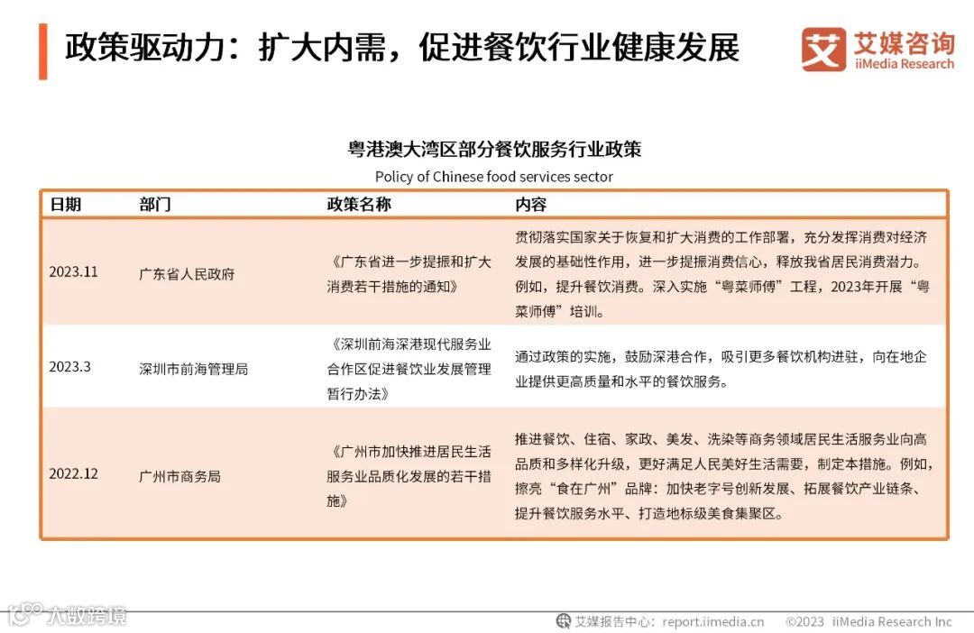 近年来,中国餐饮业得到多方面的发展鼓励及政策支持。为促进中国餐饮服务行业可持续发展,推动餐饮行业加快复苏、扩大内需等,相关部门推出了惠企政策。例如,深圳市前海管理局制定了《深圳前海深港现代服务业合作区促进餐饮业发展管理暂行办法》,加大粤港澳大湾区餐饮业发展。