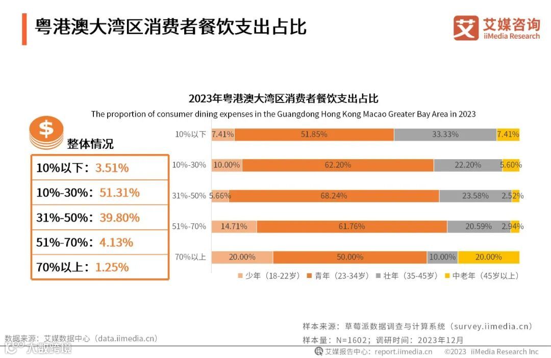 iiMedia Research(艾媒咨询)调研数据显示,超五成粤港澳大湾区消费者餐饮支出占整体支出的比例为10%-30%。餐饮消费占总支出51%-70%的人群中,青年消费者占比超六成。艾媒咨询分析师认为,年轻群体在餐饮方面消费较高,对餐饮的特色、环境、服务等要求相对较高,也对菜肴溢价接受度更高。