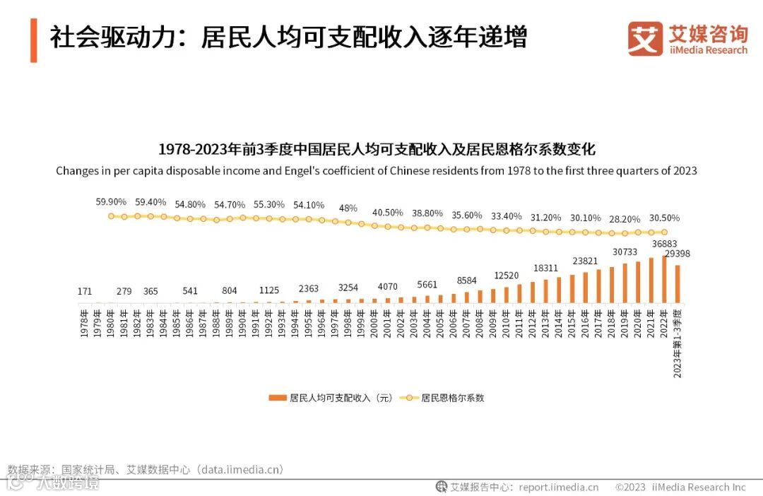 图表3.1978-2023年前3季度中国居民人均可支配收入及居民恩格尔系数变化