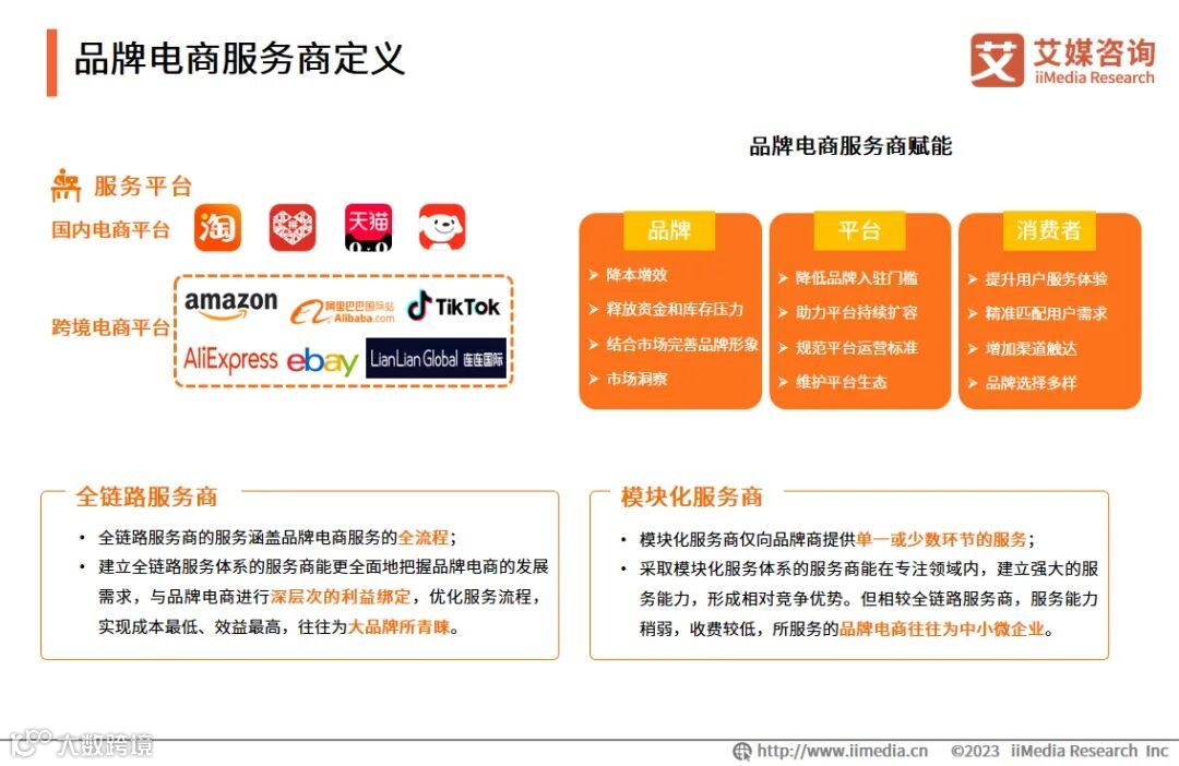品牌电商服务商是指为品牌电商的全部或部分商业经营活动提供服务的商家,是品牌商、平台及消费者之间的连接器。目前市场上可分为全链路服务商和模块化服务商,能够帮助品牌方弥补相关能力缺口,对三方进行赋能,呈现开放性、全球性等特征。品牌商、服务商和电商平台分工明确,为消费者提供丰富的商品与服务,现已形成协同发展、共同繁荣的电商生态圈。品牌电商新需求、新服务、新功能的出现也将进一步推动电子商务的发展和完善。