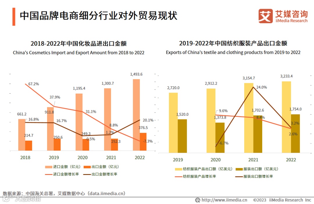 中国电商行业规模庞大,新业态发展火热。数据显示,中国化妆品出口金额除2020年小幅下滑外,整体呈稳定增长态势,2022年中国化妆品出口金额为376.5亿元,同比增长20.1%。2022年中国纺织服装产品出口额为3233.4亿美元,保持稳定增长态势;2022年中国服装出口金额为1754.0亿美元,连续多年稳居世界首位。艾媒咨询分析师认为,美妆、鞋服、母婴、个护等在品牌电商对外贸易中占据重要地位,随着化妆品、服装等品类对外贸易规模的扩大,将使品牌电商服务商享受更多品类红利,取得进一步发展。