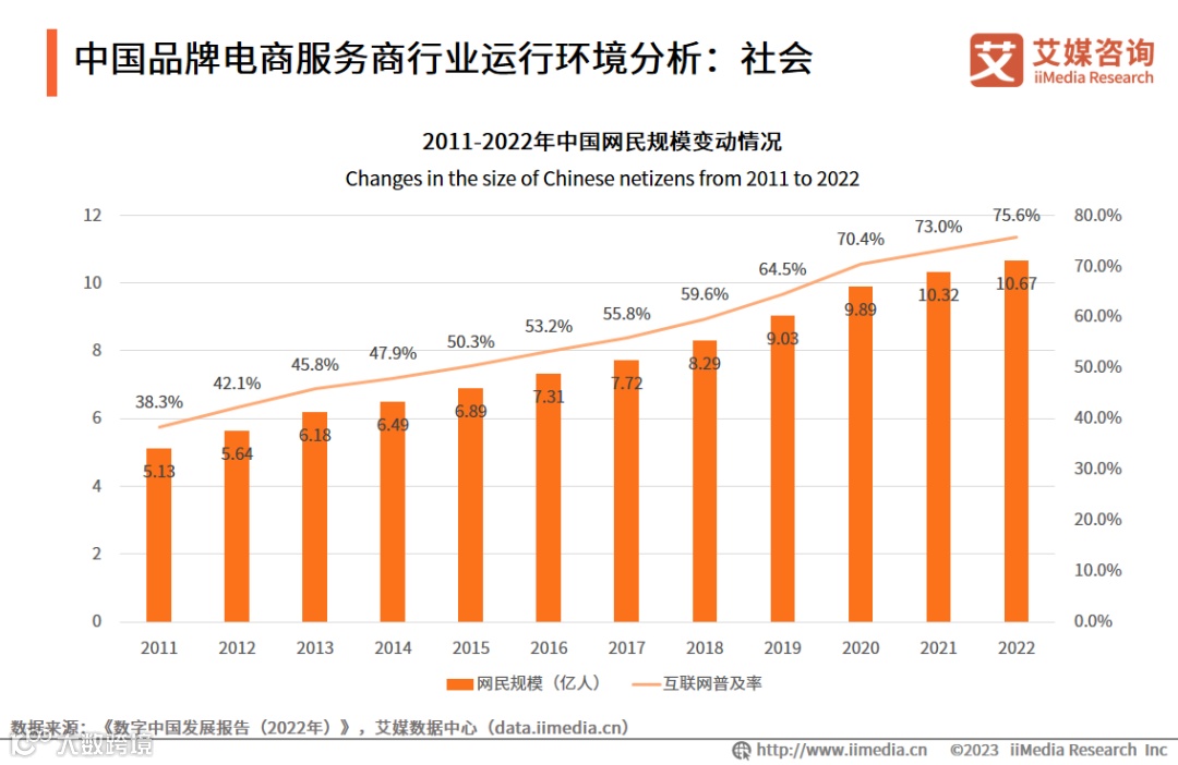 数据显示,2022年互联网普及率为75.6%,中国网民规模达10.67亿人,互联网与社会深度融合。艾媒咨询分析师认为,随着互联网普及率提高和中国网民规模扩大,“5G+工业互联网”建设加速推进,平台构建逐步完善推动平台服务数字化,促使电商行业提高渗透率,为品牌电商服务商注入新的增长动力。
