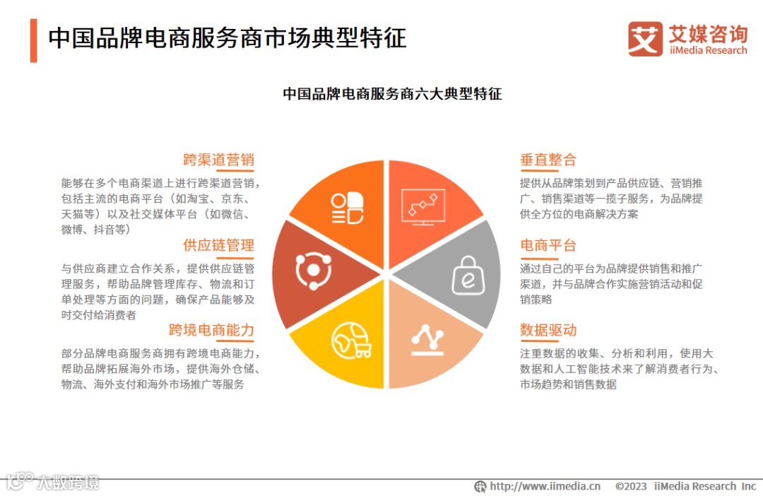 中国品牌电商服务商的典型特征包括垂直整合、电商平台、数据驱动、跨渠道营销、供应链管理和跨境电商能力,其竞争重点集中在成熟的品牌运营体系、多元渠道布局、行业数据壁垒等方面。艾媒咨询分析师认为,相关特性使得中国品牌电商服务商能够为品牌提供全面的电商解决方案,帮助品牌建立联合发展在线的销售渠道,提升市场竞争力,成为品牌成功进军电商领域的重要合作伙伴。
