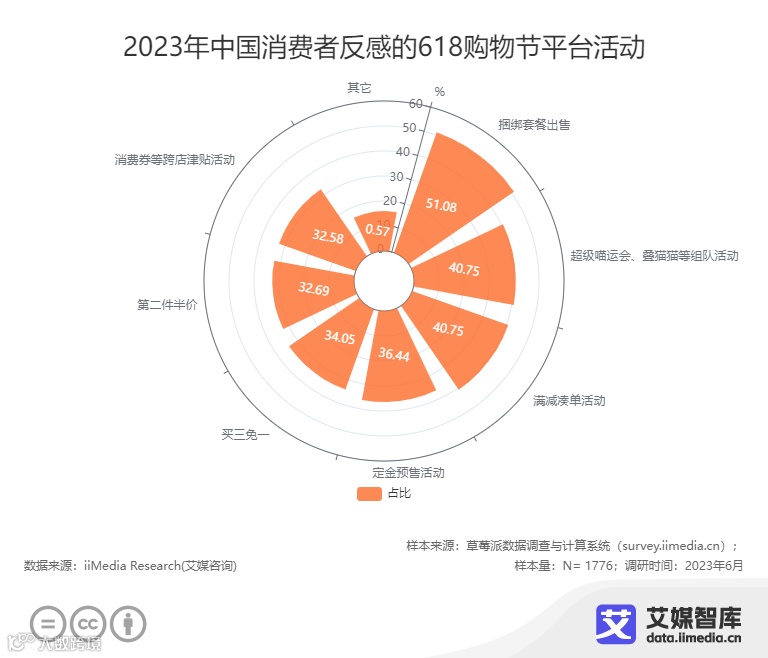 近年来,电商平台的促销玩法花样百出,设置了不少凑单满减、捆绑销售、游戏组队等活动,活动复杂到让消费者感到不悦。iiMedia Research(艾媒咨询)调研数据显示,有半成的消费者最反感的618购物节平台活动是捆绑套餐出售,其次是超级喵运会等游戏组队活动和满减凑单等。