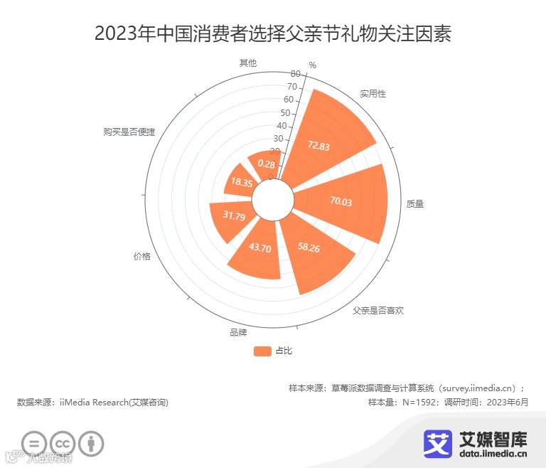 在消费者选择父亲节礼物的过程中,实用性(72.83%)以及质量(70.03%)是最主要因素。对于长辈而言,比起花里胡哨的观赏性礼物,实用性礼物更能感受到子女的诚意与关怀,“真诚”永远是吸睛共鸣的情感筹码。