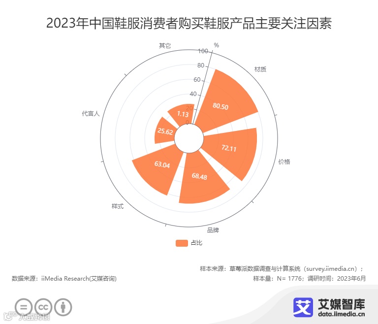iiMedia Research(艾媒咨询)调研数据显示,鞋服的材质是消费者最关注的因素,占比高达80.50%,其次是价格,占比72.11%。鞋服的材质不仅影响着穿着的舒适度和耐用性,还反映了消费者的品味和个性。