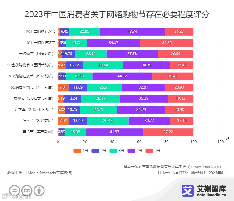 iiMedia Research(艾媒咨询)调研数据显示,有44.61%的消费者认为618购物节活动的折扣最大,其次是双十一购物节。