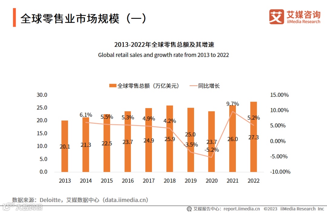 近年来,随着全球消费需求、消费渠道、消费方式的转变,全球零售额迅猛增长的时代已经过去,零售额增速放缓趋势明显。数据显示,2013-2018年全球零售总额保持小幅增长,增速放缓,2019年和2020年全球零售总额出现下滑,而2021年开始持续增长,2022年全球零售总额达到27.3万亿美元。