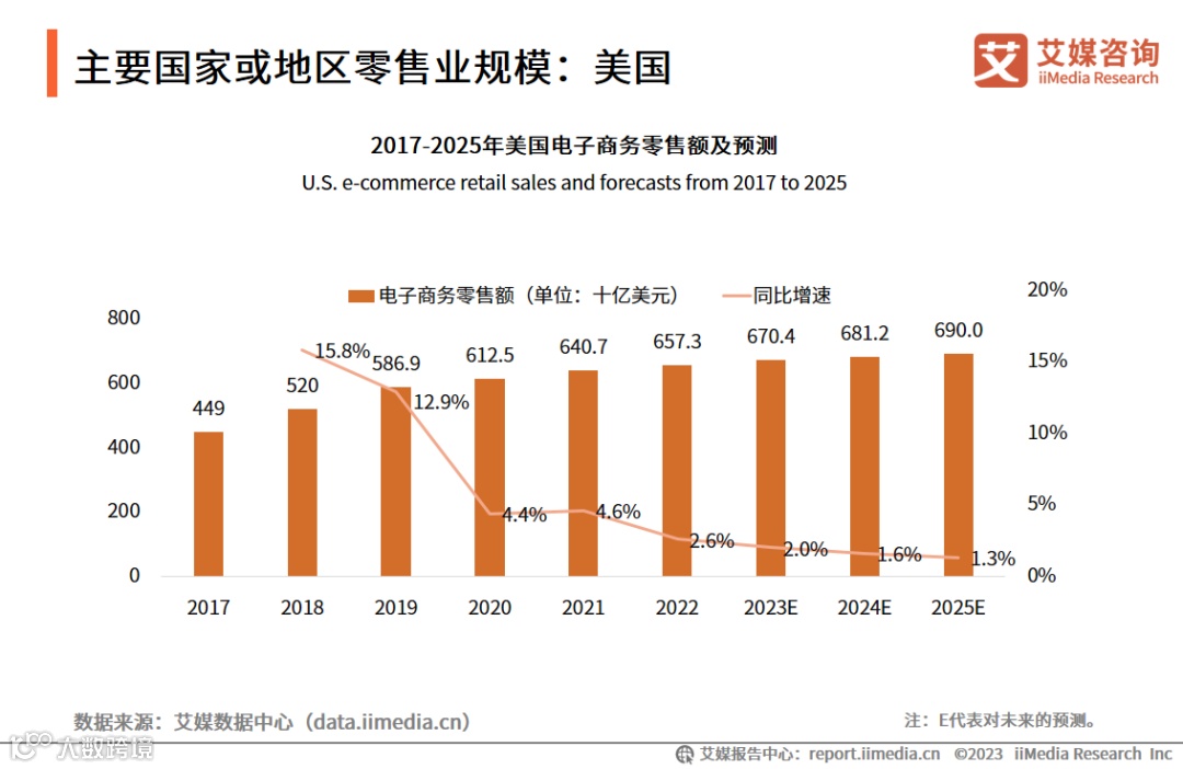 艾媒咨询分析师认为,美国电子商务零售额持续增加,将持续占据全球重要的地位。2022年美国电子商务零售额为6573亿美元,增速放缓,预计2023-2025年美国电子商务零售额增速将下降至2%以下。