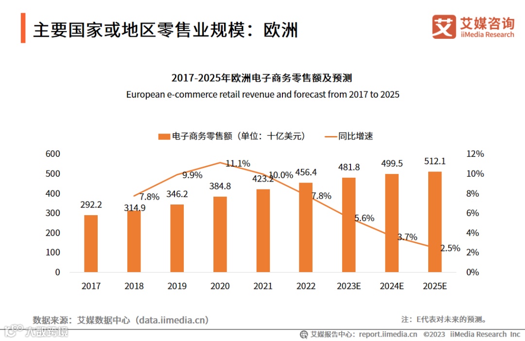 2020年,欧洲电子商务零售额为3848亿美元,增速达到新高,2022年电子商务零售额为4564亿美元,增速回调至7.8%。艾媒咨询分析师认为,欧洲地区的电子商务基本稳定,将维持在4000亿美元以上,预计2025年其零售额将突破5000亿美元。