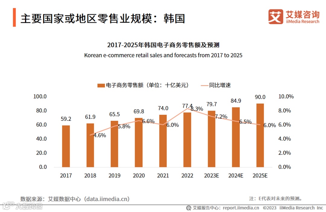 艾媒咨询分析师认为,韩国地区的电子商务零售发展稳定,2017-2022年将基本保持稳定增长,增速持续增高,2022年电子商务零售额为774亿美元,增速为8.3%,预计2025年韩国电子商务零售额将突破900亿美元。