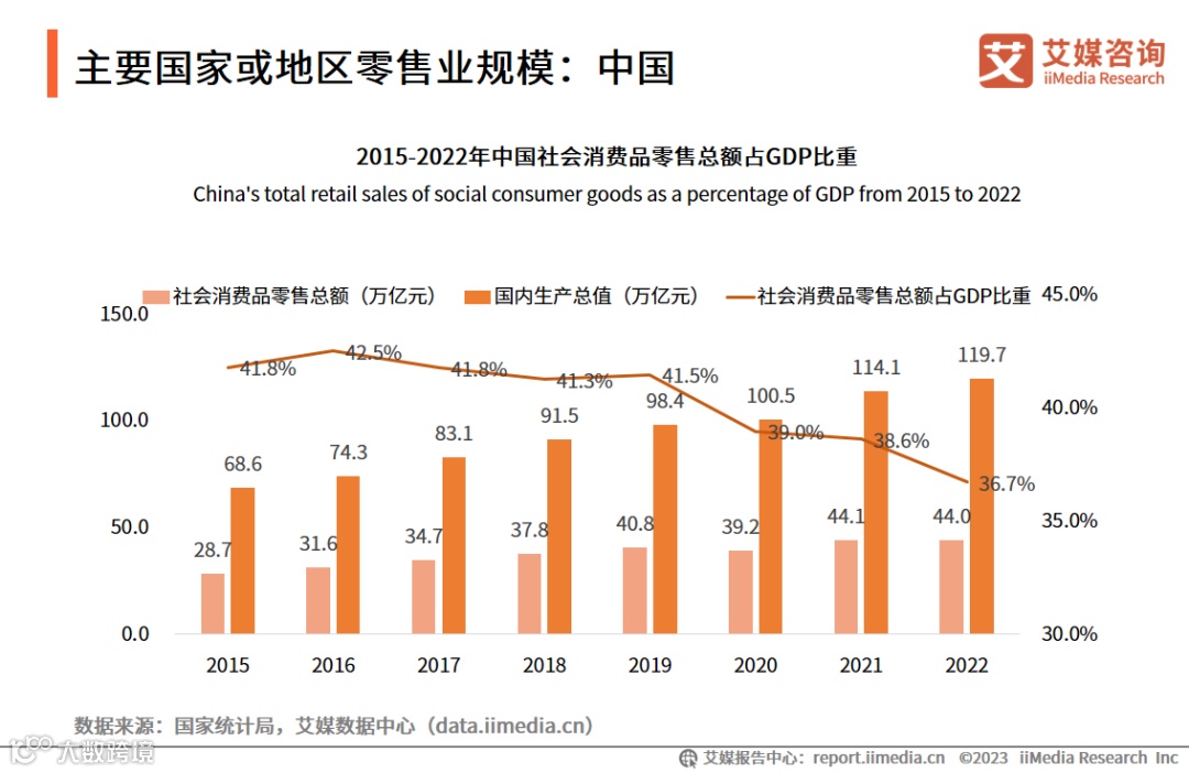 2015-2019年,中国社会消费品零售额占GDP比重超过四成,在2020年后中国社会消费品零售额占GDP比重逐年下降,2022年下降至36.7%。艾媒咨询分析师认为,在经历电商红利高峰期后,近年中国社会消费品的零售额占比略有下降,但相对其他产业,社会消费品依然是重要的经济增长贡献来源。