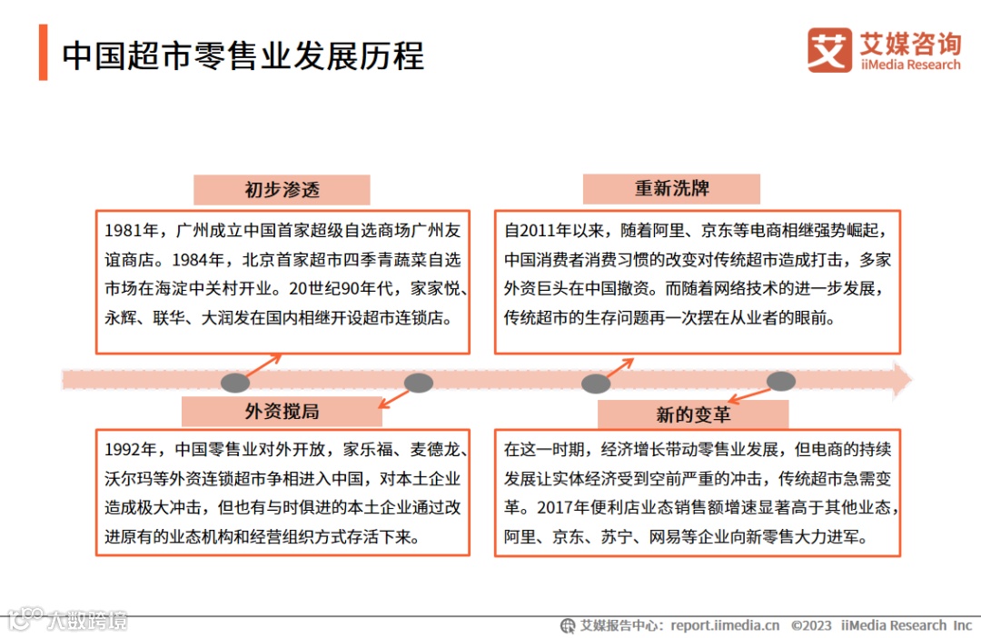 在过去的几十年里,中国的零售业态创新成为全球商业的亮点之一,已带动零售业的转型升级、数据驱动、跨界融合、价值重塑。作为中国零售业态的重要环节,中国超市零售业态包括综合超市、社区超市、便利店商店、折扣超市、高端超市、生鲜超市。中国超市的发展经历过初步渗透、外资搅局、重新洗牌和新的变革四个阶段。