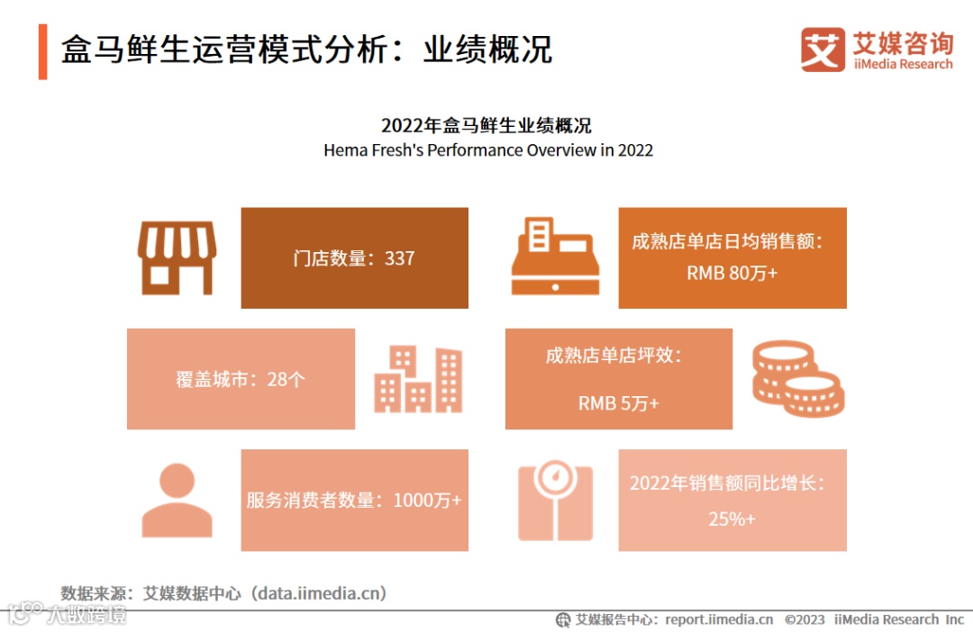 盒马鲜生在2018年披露公司经营业绩,1.5年以上门店单店日均销售额超过80万元,线上销售占比超过60%。单店平均面积为4000平方米,单店坪效超过5万元,经营效率超过同类型大卖场2-3倍。2022年,盒马鲜生销售额同比增长超过25%,实现盈利。