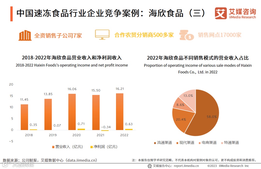 海欣公司销售模式以流通渠道为主,现代渠道、特通渠道和电商渠道为辅。公司与沃尔玛、永辉、大润发、家乐福、华润万家、麦德龙等著名连锁超市,社区便利店以及张亮、海底捞、杨国福等连锁客户均有所合作。2022年,公司营业收入增长至16.21亿元,同比增长4.59%;2022年净利润实现扭亏为盈,达到0.63亿元。