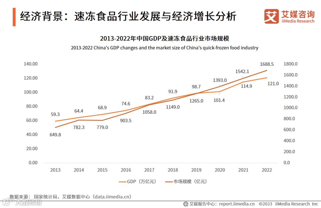 数据显示,中国速冻食品行业发展与经济发展步调基本一致。速冻食品行业市场规模与GDP的变动在数值上均呈现上升趋势,2022年中国速冻食品行业市场规模已达1688.5亿元。艾媒咨询分析师认为,新常态下中国经济增长速度将由高速向中高速转换,速冻食品行业市场规模将会呈现稳步上升趋势。