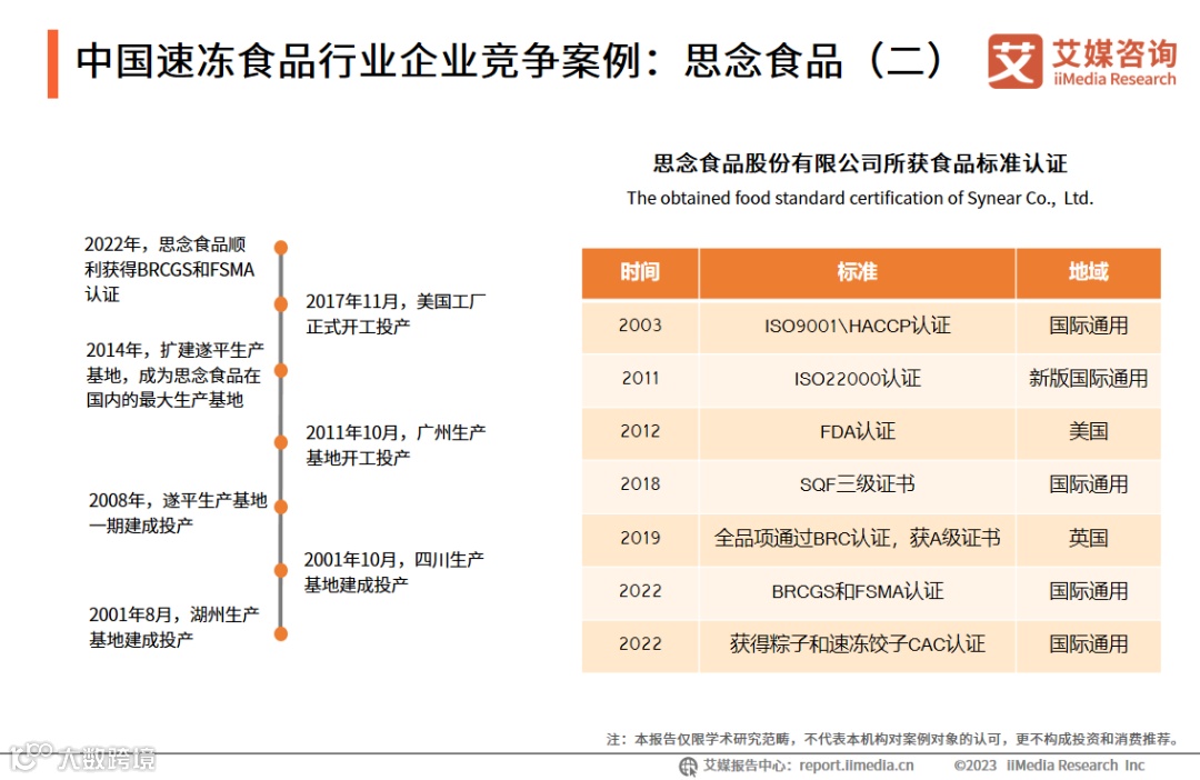 根据思念食品官网,公司拥有5个国内生产基地,几十条现代化的速冻及常温生产线、几万吨低温冷库,产品有500多个花色品种,年生产能力超过90万吨。在食品质量上,公司通过了国内多项质量检测标准,是2008年北京奥运会速冻包馅食品独家供应商。在国际上也获得了多个国家的食品质量标准认可。