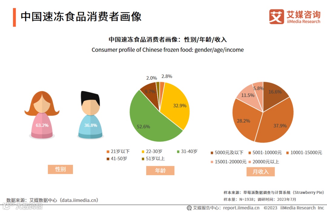 iiMedia Research(艾媒咨询)数据显示,中国速冻食品女性消费者占比较高,达63.2%;年龄段集中在31-40岁,占52.6%;中高收入群体占比较大,月收入多集中在5001-10000元,占比为37.9%,其次是10001-15000元、5000元及以下,分别占28.2%、16.6%。