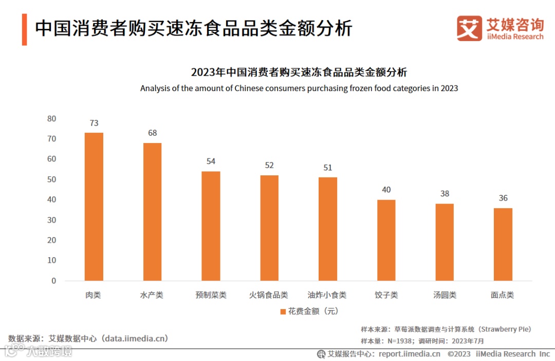 iiMedia Research(艾媒咨询)数据显示,2023年中国消费者单次购买肉类速冻食品金额最高,达到73元;其次是水产类,单笔购买金额为68元;随后是预制菜类,消费者单次购买花费金额达到54元。艾媒咨询分析师认为,肉类、水产类速冻食品原材料价格相对较高,且随着消费观念的转变,消费者对肉类和水产类速冻食品需求较大,往往单次购买较多数量的肉类和水产类速冻食品。