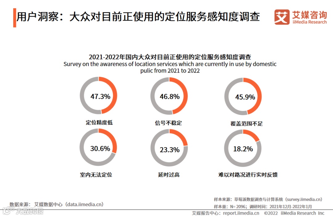 调研数据显示,国内大众对定位服务存在不同程度上的顾虑,对定位精度低(47.5%)、信号不稳定(46.8%)及覆盖范围不足(45.9%)是三大主要感知。