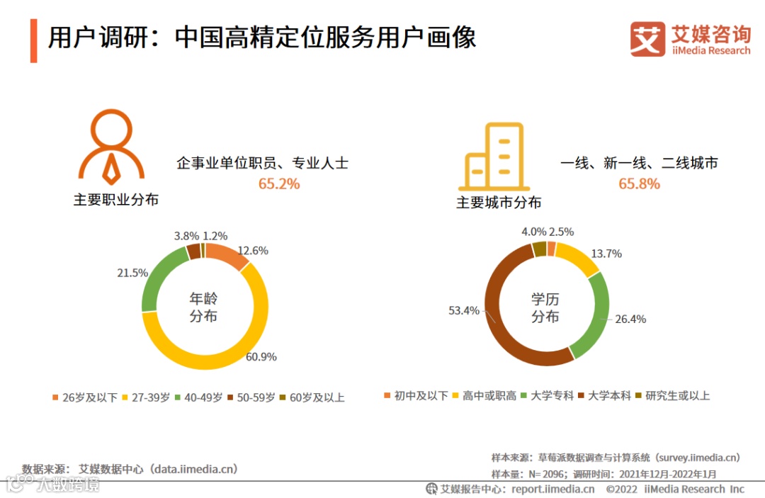 本次调研挑选超2000名国内大众用户为调研对象,用户主要集中在国内一二线城市中27-39岁的企事业单位职员和专业人士,目标是调查大众对目前他们所使用的定位服务,以及高精定位服务市场的认知和期待。