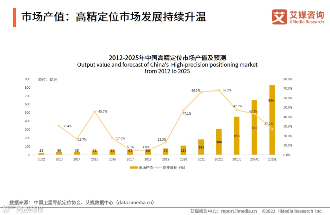 iiMedia Research(艾媒咨询)数据显示,2020年中国高精定位市场产值约110亿元,增长率为47.1%;2021年中国卫星导航与位置服务产业产值约为4650亿元,预计2023年后平均保持20%以上增速,2025年产值规模突破1万亿元,产业发展具有巨大的市场潜力,处于一片蓝海市场。