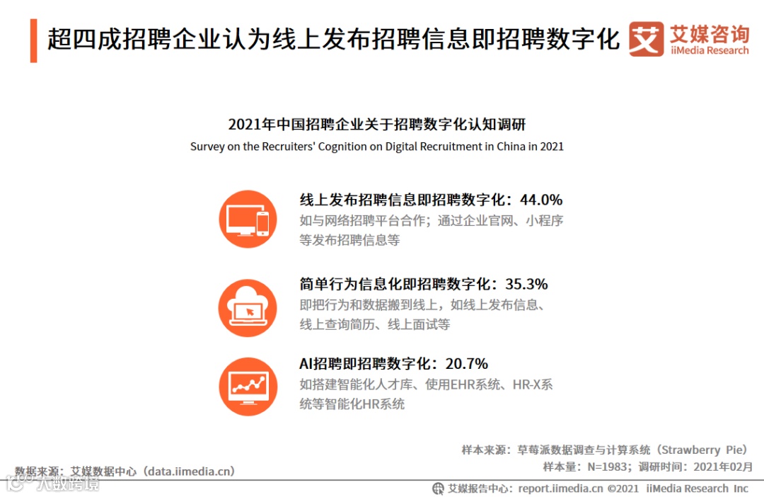1. 超四成招聘企业认为线上发布招聘信息即招聘数字化