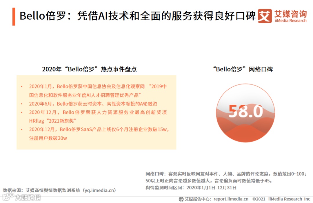 艾媒商情舆情数据监测系统显示,系统监测期间,Bello倍罗网络评价好,网络口碑指数达到58.0。艾媒咨询分析师认为,Bello倍罗通过核心产品AI技术中台能够有效帮助中大型企业及第三方招聘平台提高招聘效率及核心能力。2020年SaaS产品的应用得到进一步发展,加强了Bello倍罗对中小企业的服务覆盖;凭借领先的AI技术和全面的服务,Bello倍罗整体口碑正面,在行业内享有美誉。