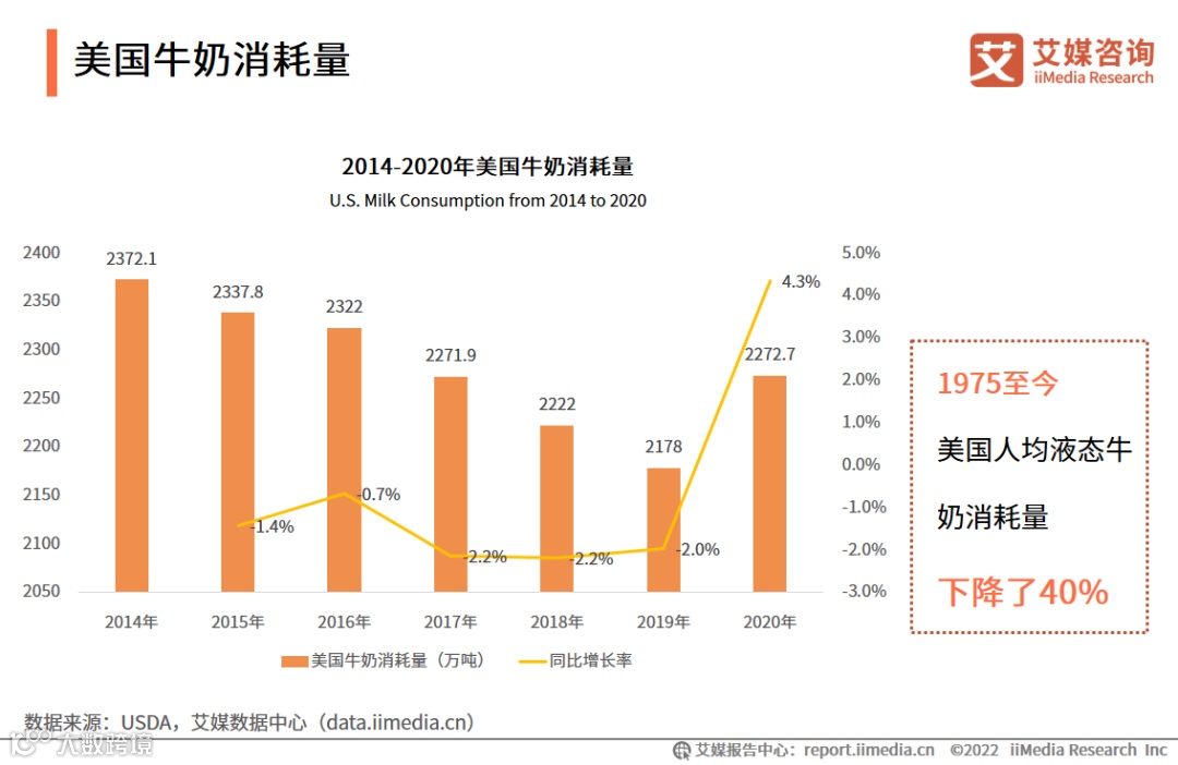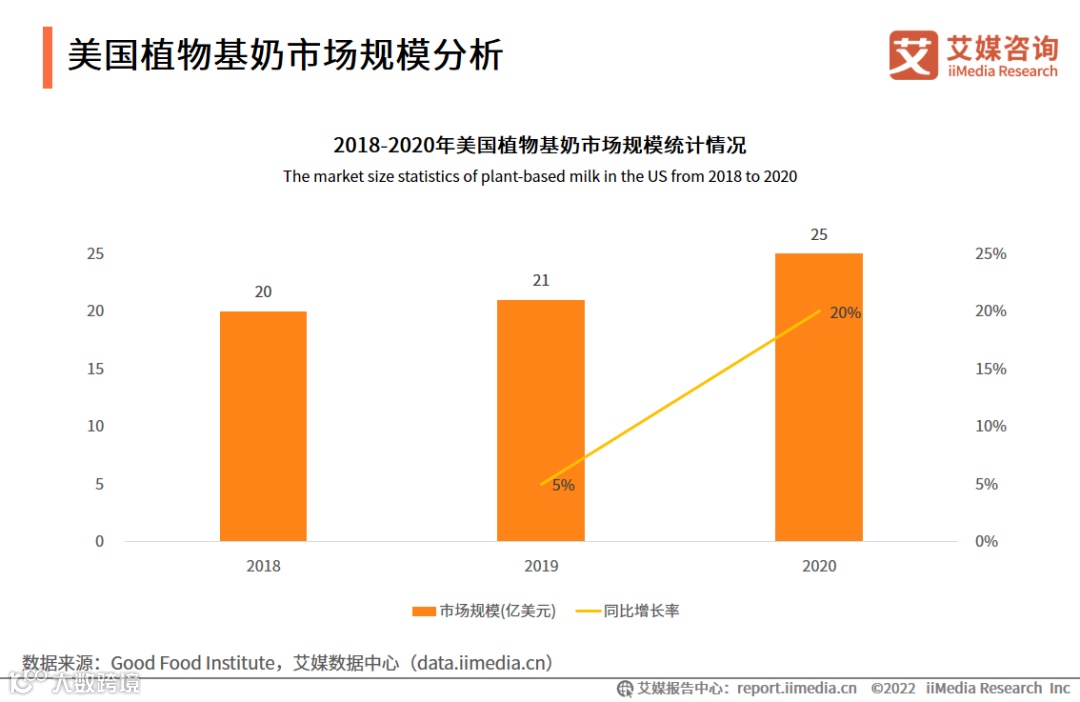 艾媒咨询分析师认为,随着植物基产品接受度加速提升以及新冠疫情的催化,美国消费者对符合健康趋势产品需求进一步扩大,因而美国植物基奶的市场规模加速增长。